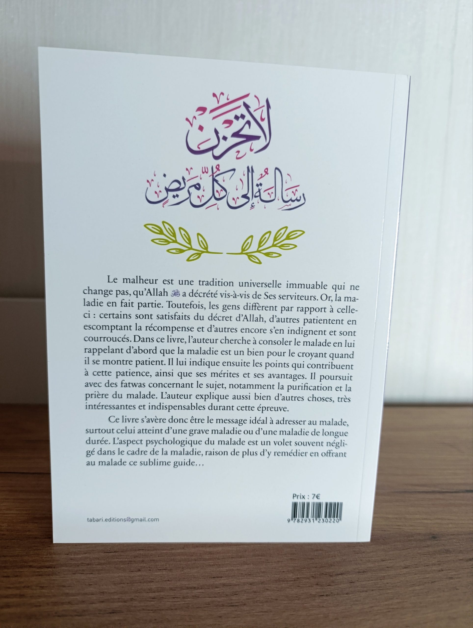 • Le malheur est une tradition universelle immuable qui ne change pas, qu’Allah a décrété vis-à-vis de Ses serviteurs. Or, la maladie en fait partie. Toutefois, les gens diffèrent par rapport à celle-ci : certains sont satisfaits du décret d’Allah, d’autres patientent en escomptant la récompense et d’autres encore s’en indignent et sont courroucés. Dans ce livre, l’auteur cherche à consoler le malade en lui rappelant d’abord que la maladie est un bien pour le croyant quand il se montre patient. Il lui indique ensuite les points qui contribuent à cette patience, ainsi que ses mérites et ses avantages. Il poursuit avec des fatwas concernant le sujet, notamment la purification et la prière du malade. L’auteur explique aussi bien d’autres choses, très intéressantes et indispensables durant cette épreuve.